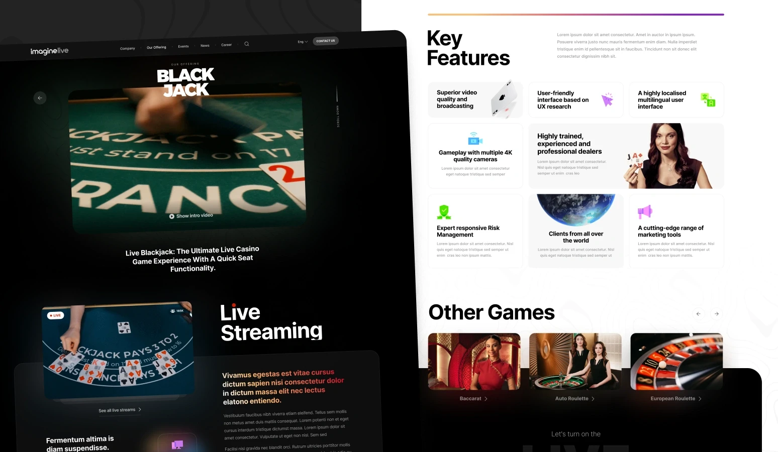 The website was shaped as a branded experience for showcasing live casino products through motion, pacing, and a clean visual system. Instead of static content blocks, the structure unfolds section by section, giving every game, event, and company page its own role in the story.