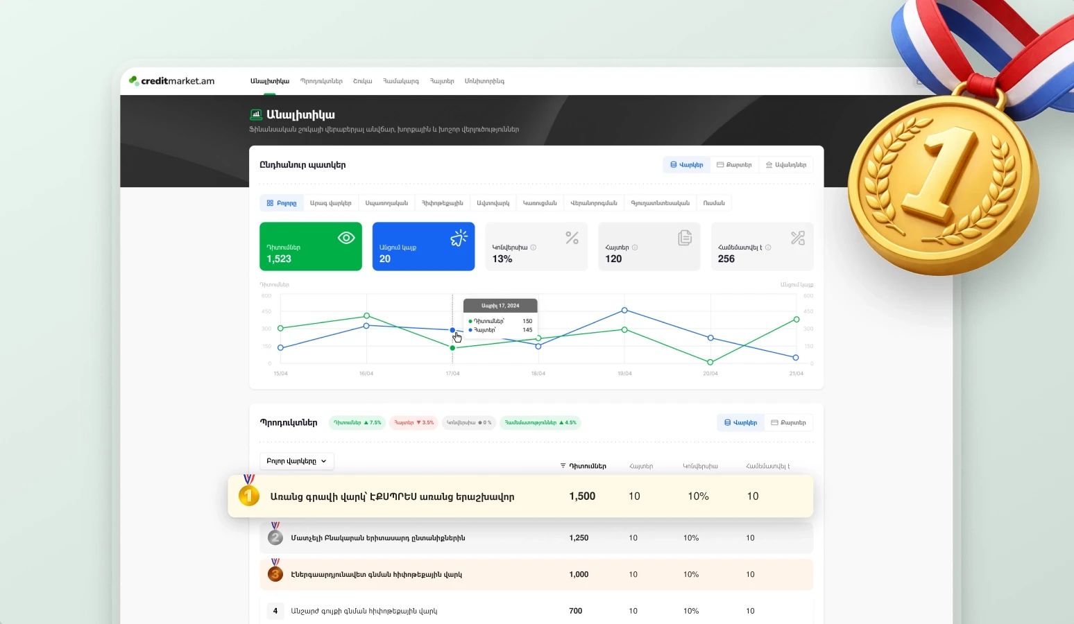 Analytics became the second core product of CreditMarket. It gathers live data from the user-facing site and turns it into visual dashboards for banks and the internal team. Every click, comparison, and submitted application feeds into the system to show what users search for, which banks perform best, and where processes slow down.